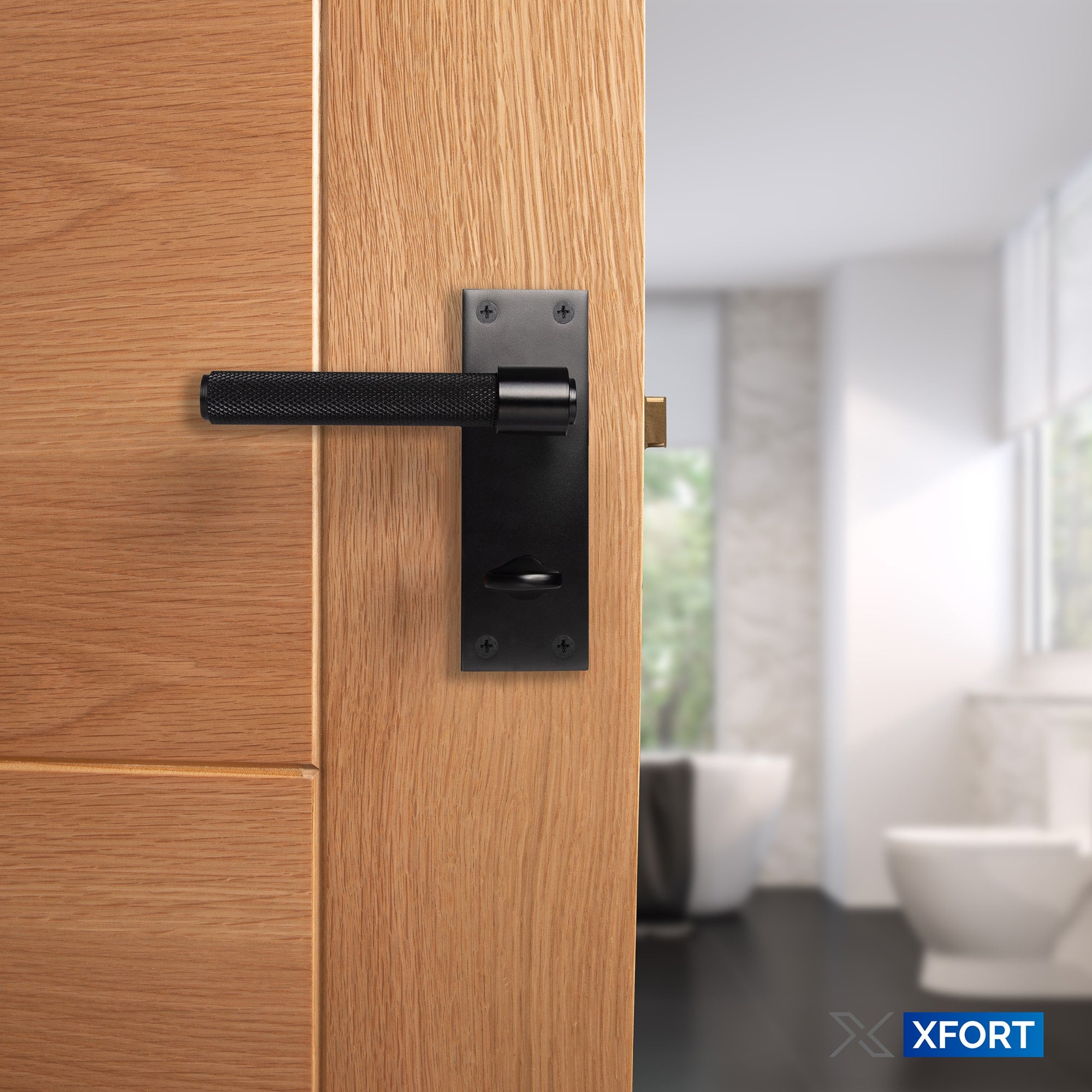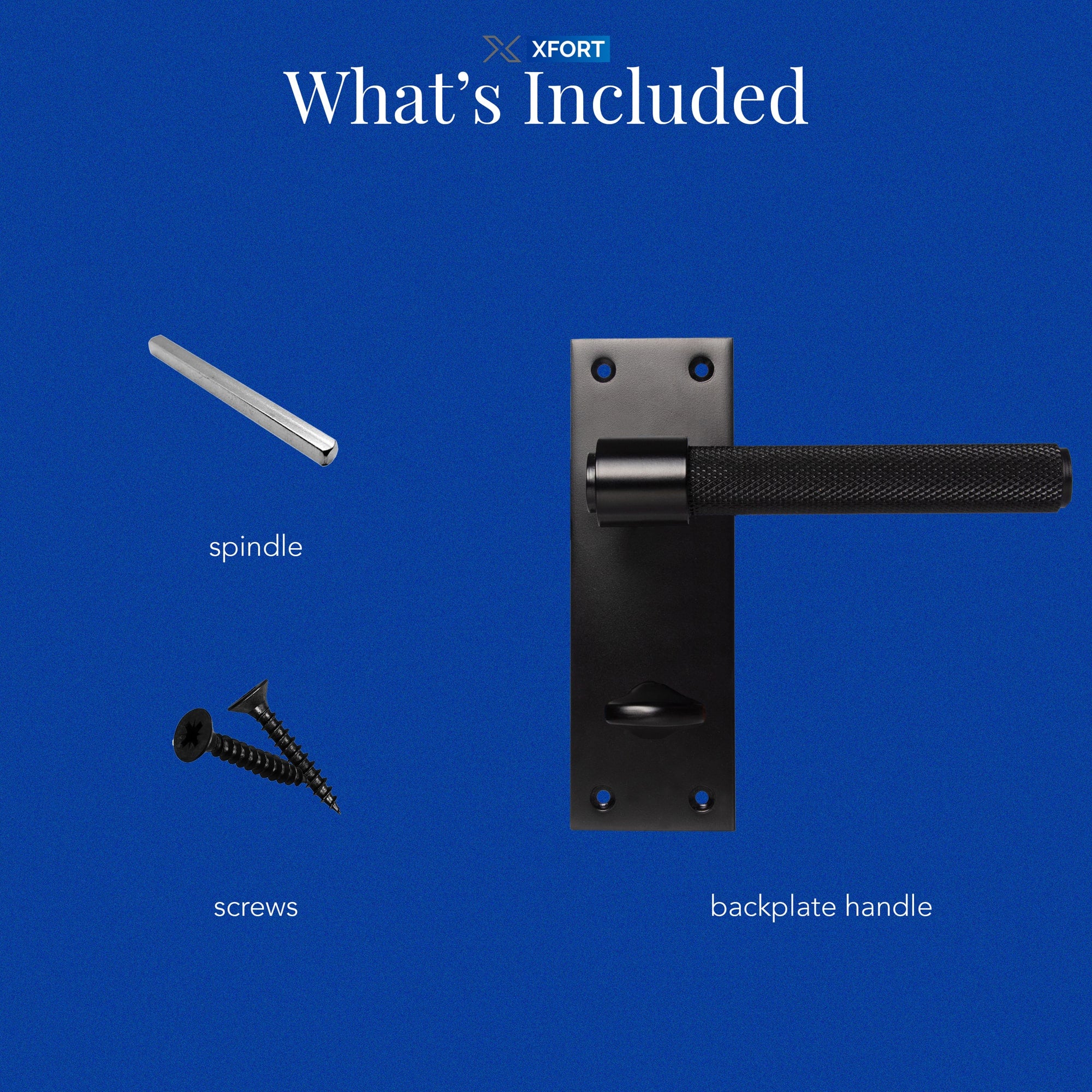 FITTINGS: This door handle set comes with a spindle bar and colour-matched screws to blend seamlessly with your door. The bathroom lock is not included.