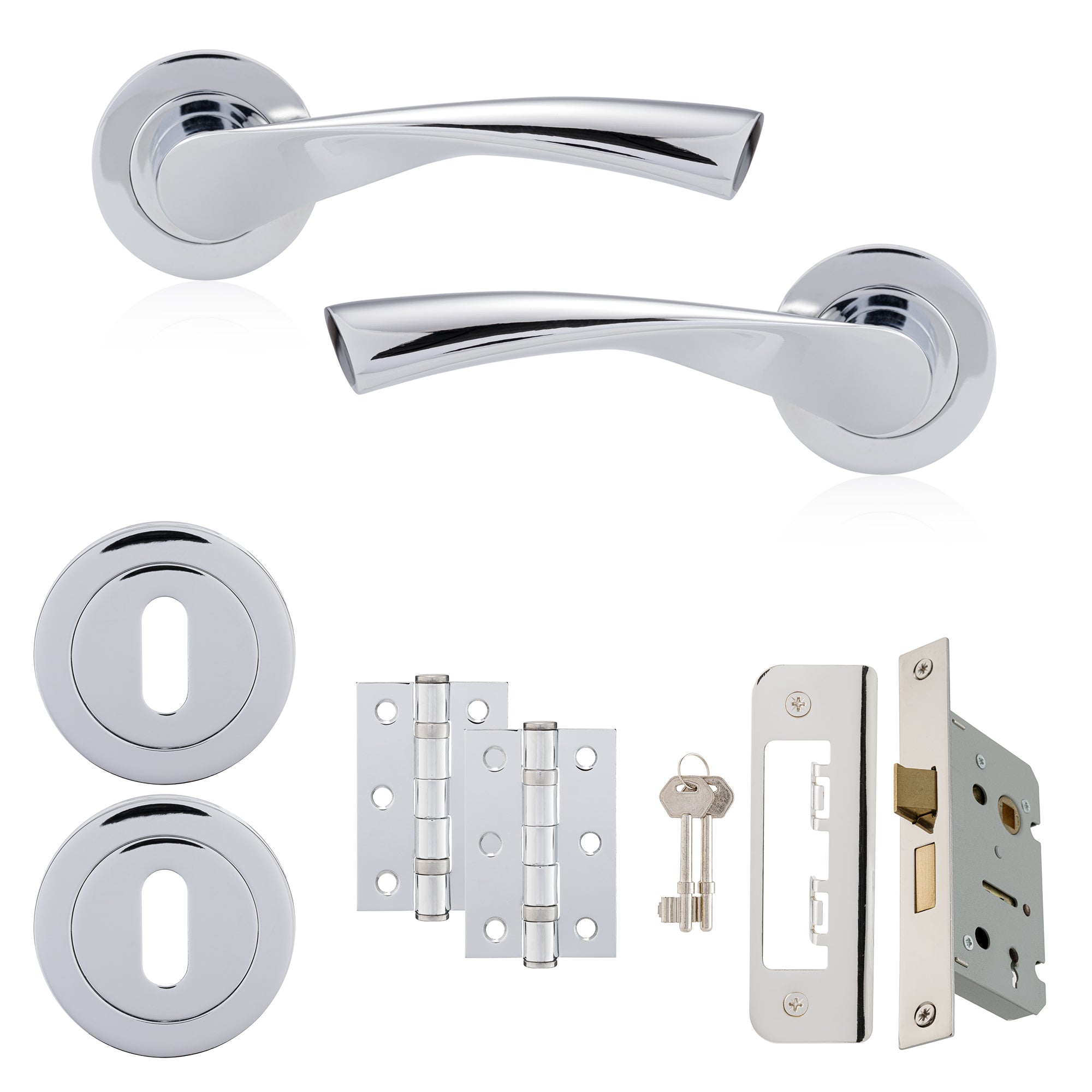 COMPLETE SET: This complete door pack includes Warped lever on rose door handles, a 65mm Sashlock, a pair of 75mm (3”) ball bearing hinges and escutcheons.